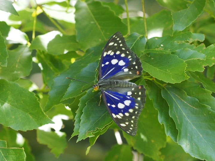 昨年からタテハBIG3(本種、オオウラギン、オオイチ)の写真のレベルアップを図っていますが、どれも少しは進歩したかなぁという程度。 この写真はいい青紫色が出ているものの、前翅が下がっていて今一つです。