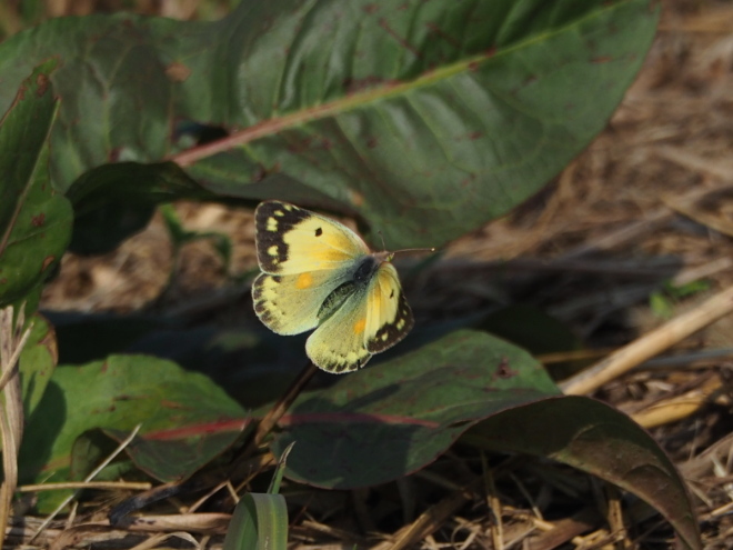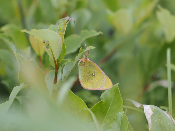 陽が陰り、葉裏に静止した♀。 黄色にピンクの縁取りというパステルカラーが目を引きます。 当日はあまり晴れ間が続かず、ガスがかかったり曇ったりしがちな天候でした。