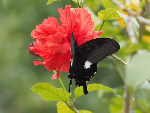 クサギで吸蜜中の♀。 晩夏、この花には他の黒色系アゲハもよく訪れる。