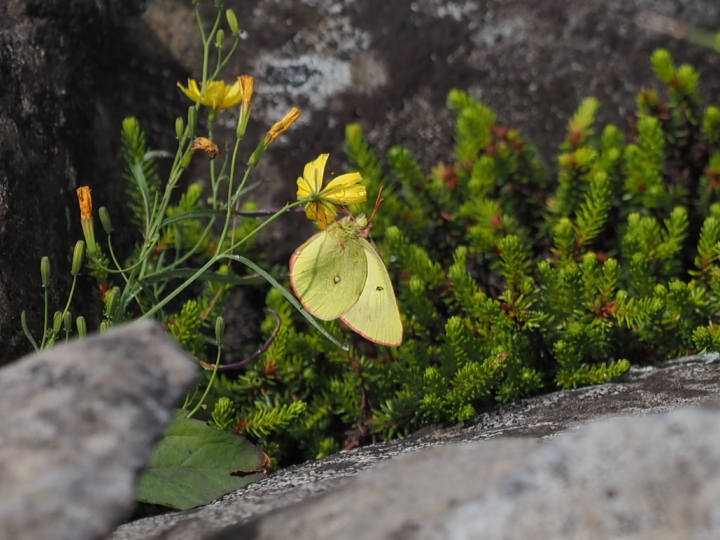 前種モンキチョウと似ているが、本種は浅間山系と飛騨山脈の一部のみで見られる。